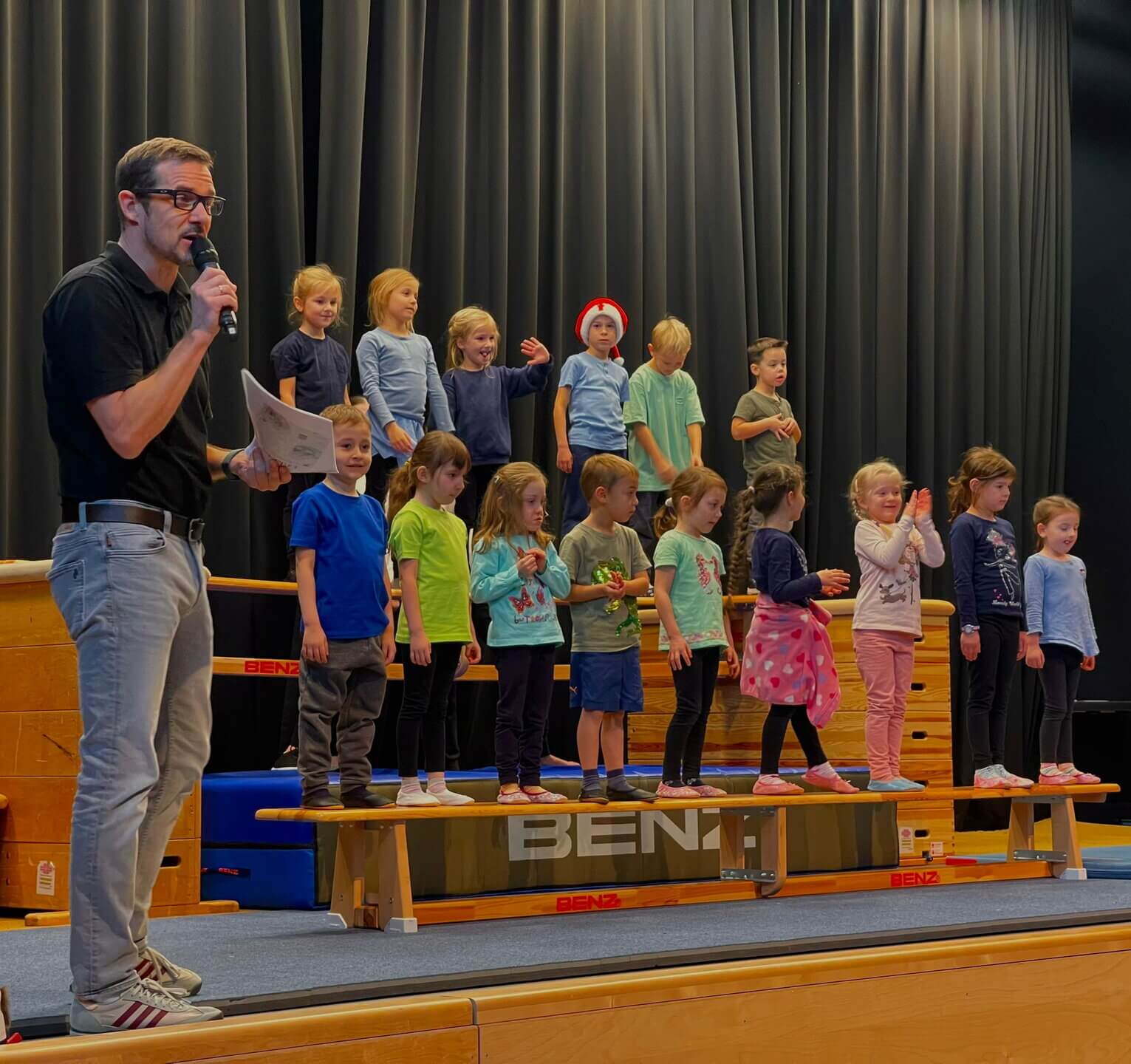 Zum Schluss wurden alle Turnkinder und Übungsleiterinnen nochmal auf die Bühne geholt, um ein kleines Nikolausgeschenk entgegenzunehmen.